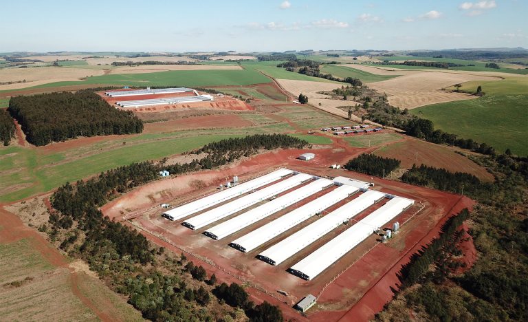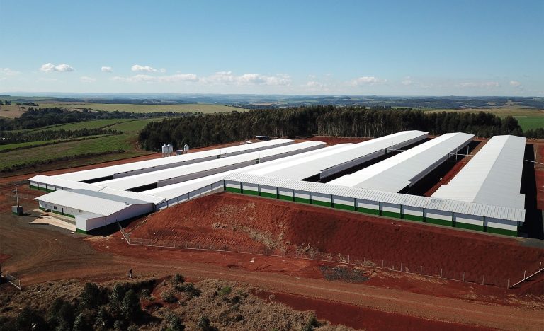 Construção com 12 aviários de 13x162m e 2 corredores de 3,80x140m, totalizando 26.336m² de estrutura pré-moldada.